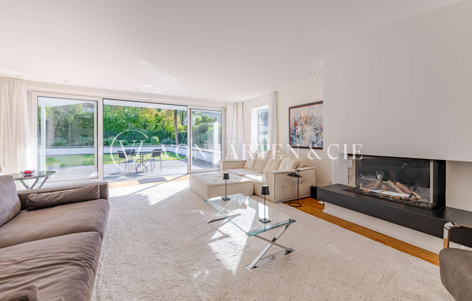 Die Wohnung überzeugt mit großzügiger Raumgestaltung und lichtdurchflutetem Ambiente. Der offene Wohn- und Essbereich mit bodentiefen Fenstern und einem stilvollen Kamin bildet das Herzstück des Hauses und öffnet sich zur weitläufigen Südterrasse mit Blick in den liebevoll angelegten Garten, der Ihnen zur alleinigen Nutzung zur Verfügung steht. Drei edle Kamine verleihen den Wohnräumen eine besondere Atmosphäre und sorgen ganzjährig für ein behagliches Wohngefühl.