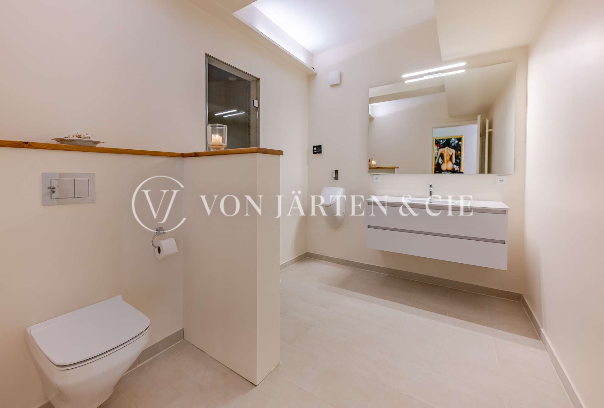 Der private Rückzugsbereich im Erdgeschoss überzeugt mit einer großzügigen Master-Suite inklusive Ankleide und luxuriösem Bad en suite mit bodengleicher Dusche. Edles Eichenparkett, glatte Wandflächen, Fußbodenheizung und hochwertige Armaturen schaffen ein Ambiente, das Stil und Behaglichkeit perfekt verbindet.