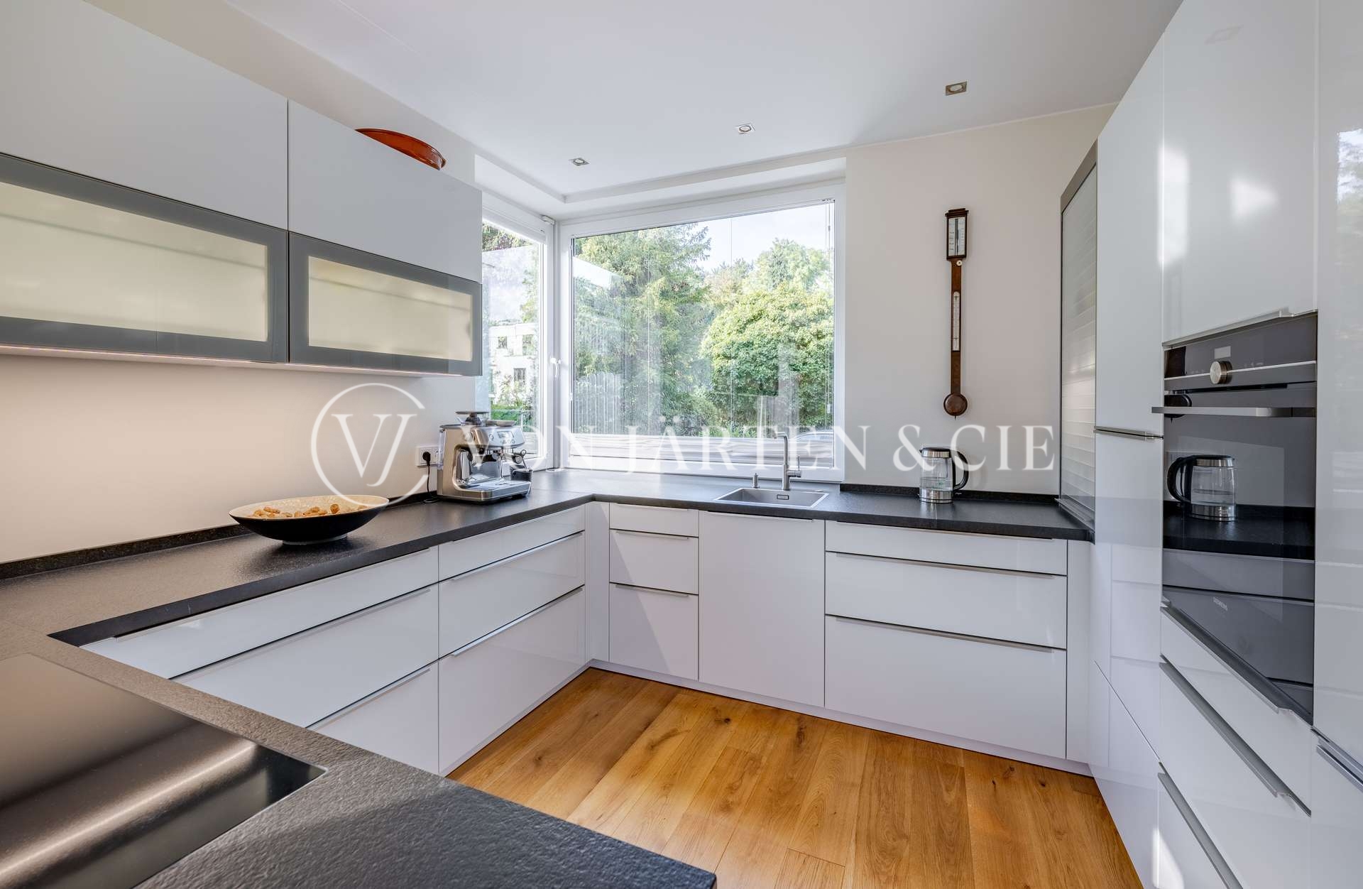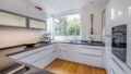 Eine hochwertige Einbauküche mit Kochinsel fügt sich harmonisch in das Raumkonzept ein und bietet den idealen Rahmen für gesellige Abende. Im unteren Gartengeschoss erwartet Sie ein zweiter, großzügiger Wohnbereich mit direktem Zugang zu einer weiteren Terrasse und dem liebevoll angelegten Garten.